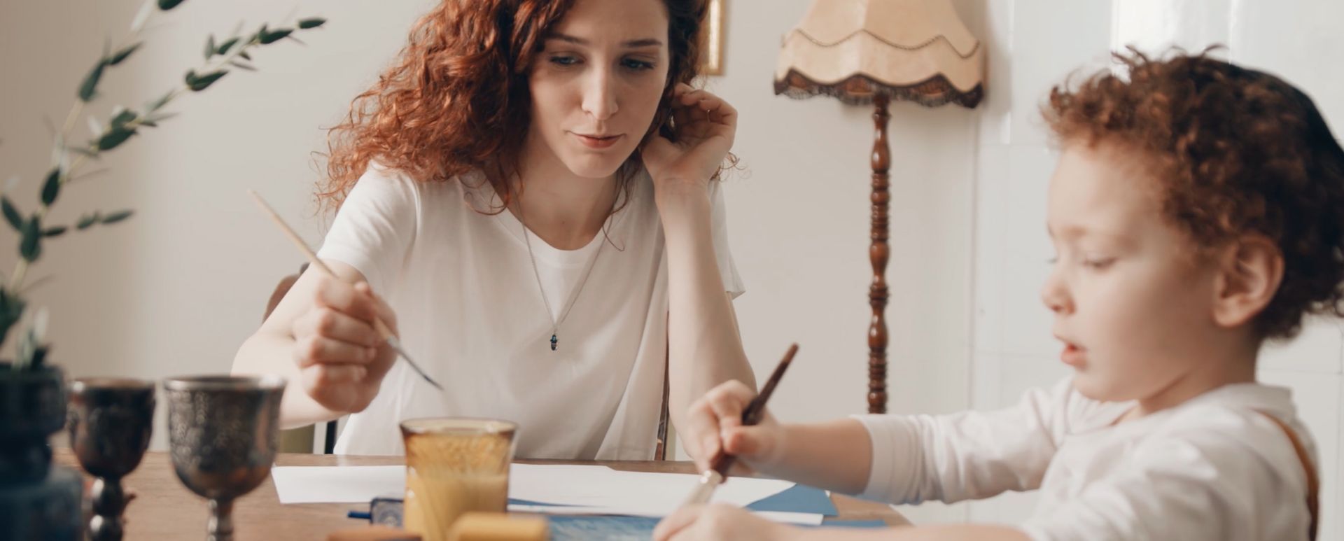 Young child in white shirt reaching for colored pencils at a desk, with bookshelves in the background.